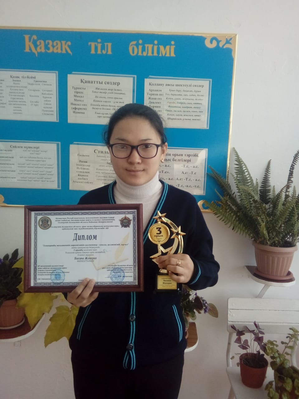 10-сынып оқушысы Бисина Жанерке "Электронды мемлекеттік көрсетілетін қызметтер - сапалы, қолжетімді, шұғыл" атты облыстық шығармалар байқауында ІІІ орынға ие болып, Диплом, Кубок және естелік сыйлықпен марапатталды